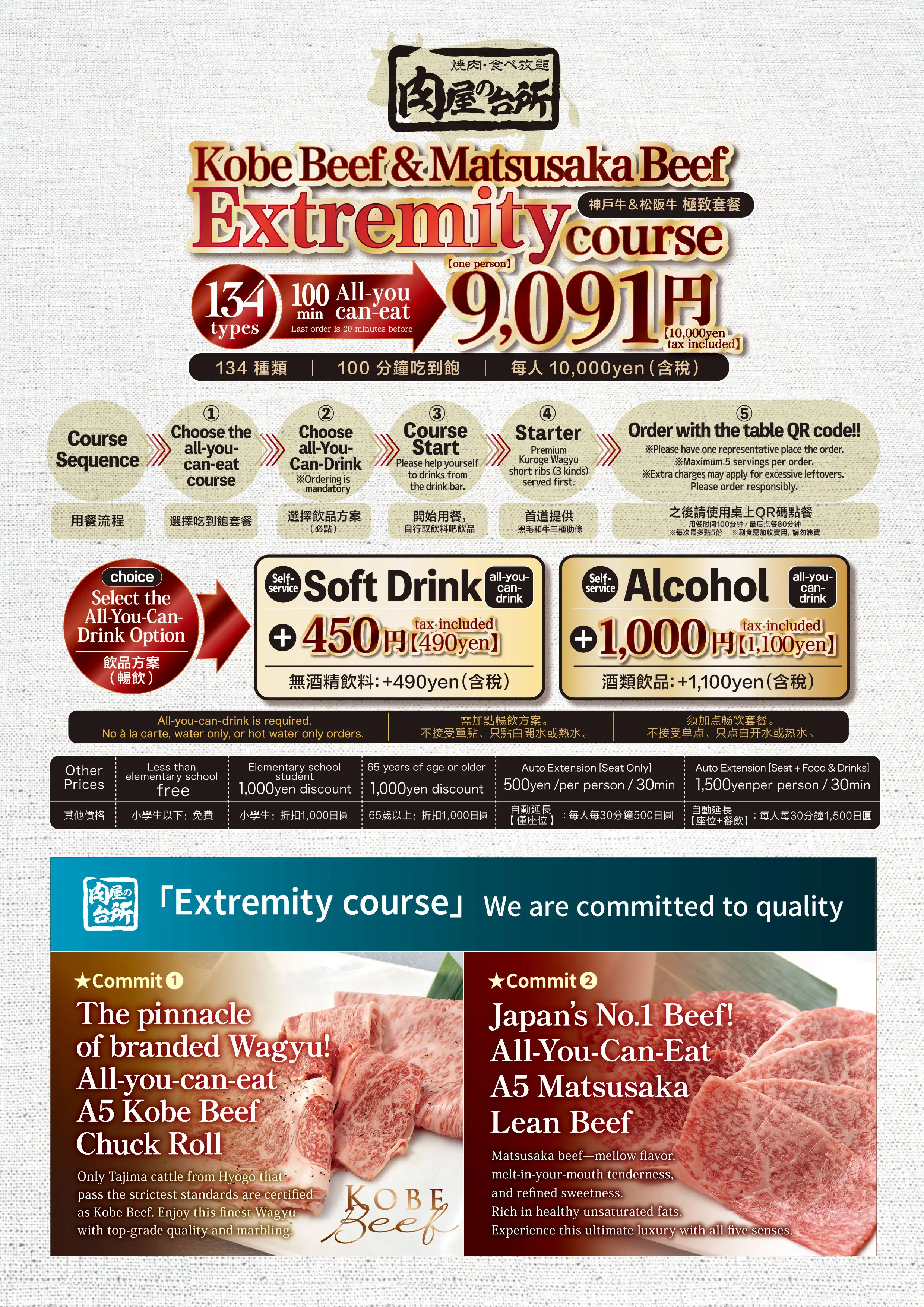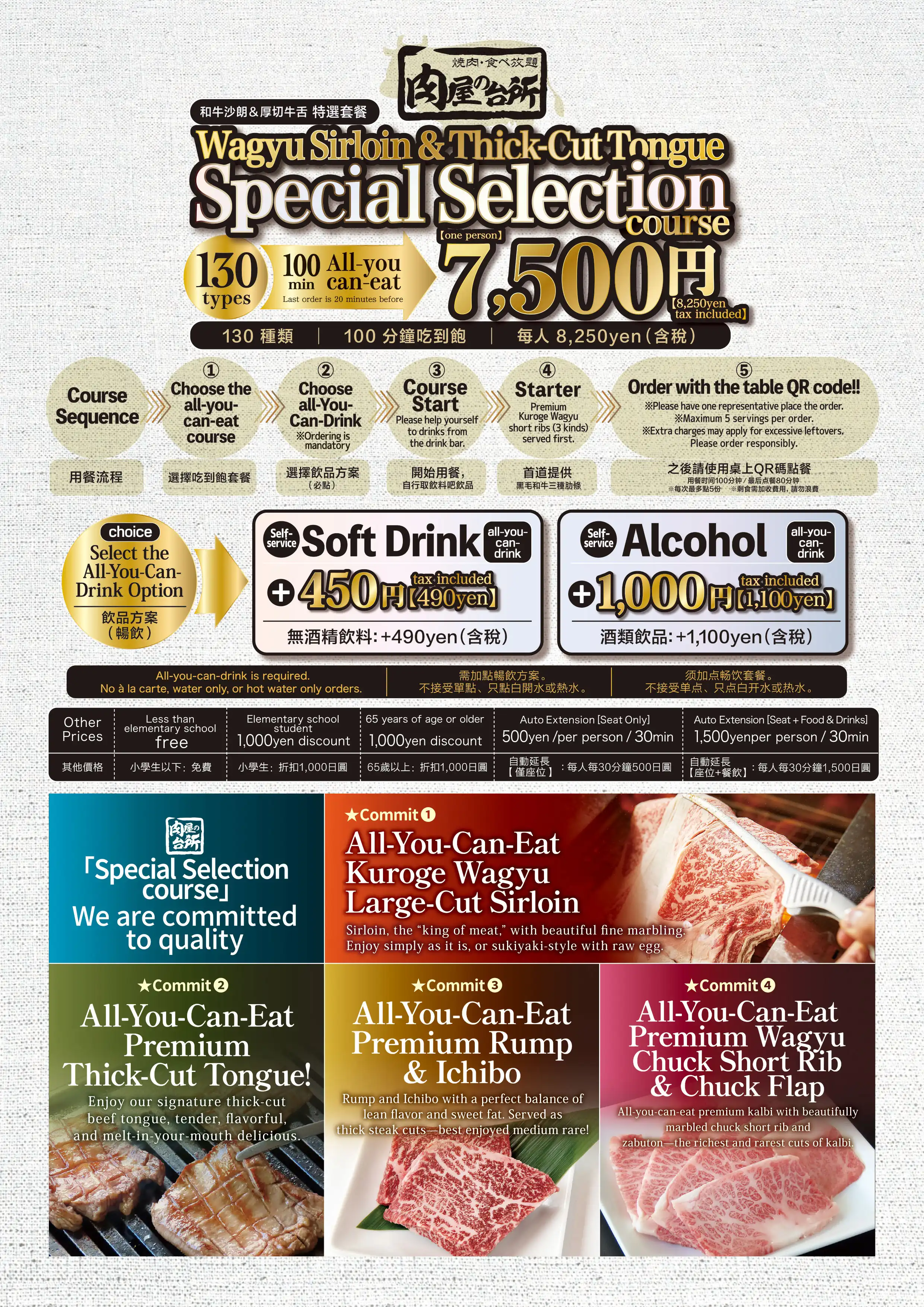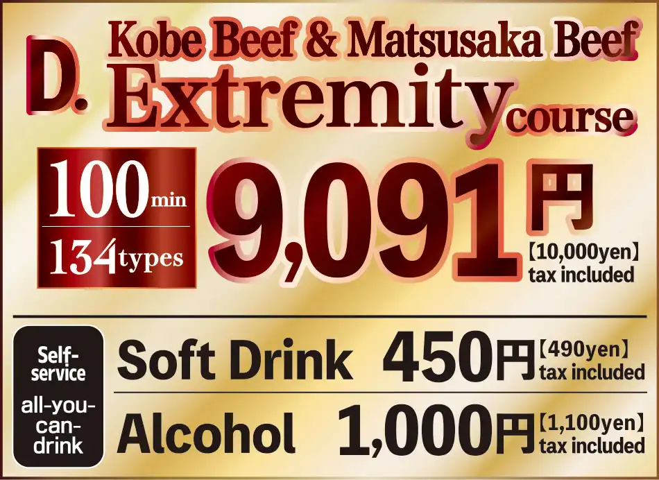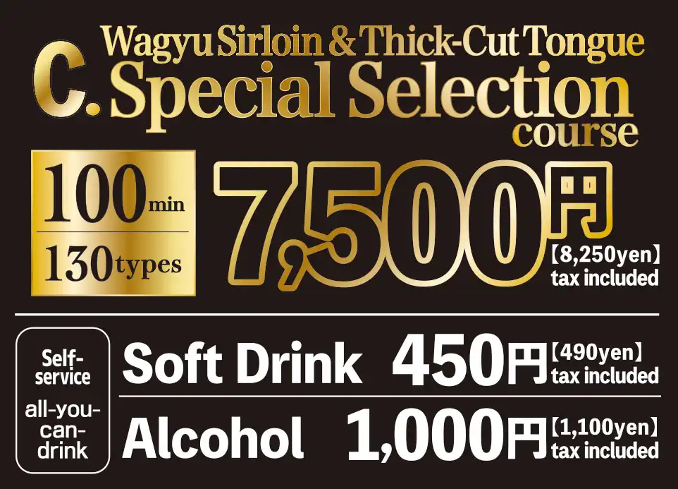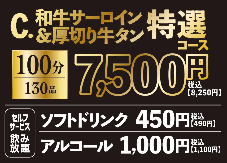 高級部位である黒毛和牛ランプやイチボ、きめ細かい霜が降った黒毛和牛サーロイン、圧倒的迫力のとろける厚切り牛タンなどが全て食べ放題に含まれる高級感あふれるコースです。事前予約で和牛肉パフェを無料サービスしております。ご希望のメッセージを添えて大切な記念日を彩ります。席時間100分制LO80分ーーーーーー【飲み放題料金】※必ずつけていただいており、詳細は当日ご案内させていただきます。(通常価格)ソフトドリンク450円(税込490円)アルコール:1,000円(税込1,100円)(LINE友達価格)ソフトドリンク350円(税込380円)アルコール:750円(税込820円)