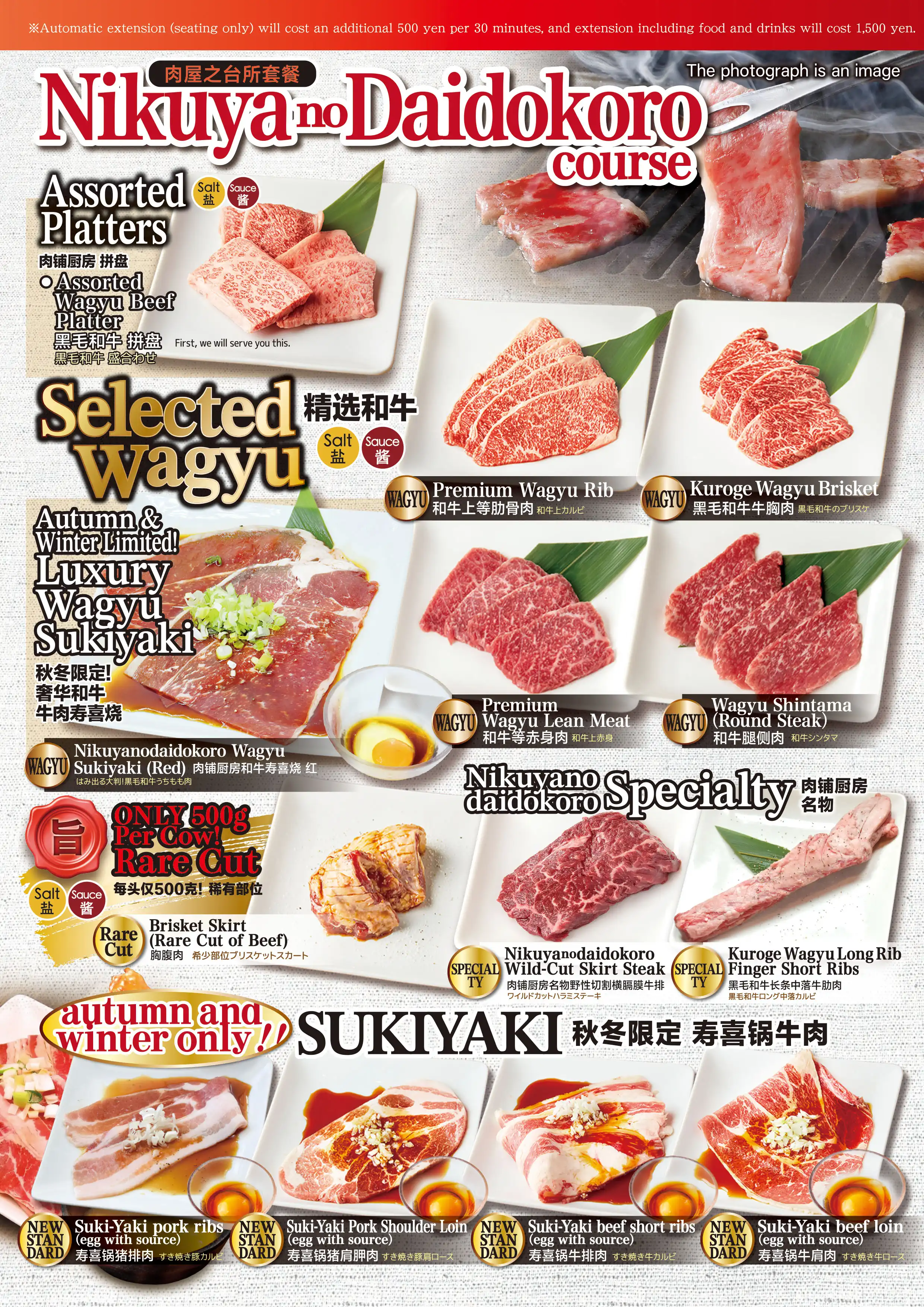 | コース内容 | 【最初のサービスプレート】 〇黒毛和牛盛り合わせ 特上カルビ/和牛上カルビ/和牛旨味カルビ <食べ放題MENU> ☆厳選 和牛 和牛上カルビ/肉屋の旨味カルビ/和牛すき焼き肉/和牛壺漬けカルビ 【 肉屋の台所 名物 】(塩・タレ) 肉屋名物ワイルドカットハラミステーキ 【不動の定番】 肉屋のカルビ 塩(旧ハラミカルビ) 肉屋のカルビ タレ(旧ハラミカルビ) 【!!秋冬限定!!すき焼き肉】 すき焼き牛カルビ すき焼き大判牛ロース すき焼き牛ロース すき焼き豚カルビ すき焼き豚肩ロース 【牛】(塩・タレ) 炙りバラカルビ 王道♪ハラミ ロース 【復活の壷漬け】(味噌・辛味噌) 壷漬けホルモンミックス 【ホルモン】(塩・タレ・味噌) やわらか旨豚ホルモン 絶品!旨味噌ホルモン レバー 【豚・鶏】(塩・タレ) 豚タン塩 豚ハラミ 豚バラカルビ 豚肩ロース トントロ 鶏もも 厚切りベーコン ソーセージ 【ネギ塩】 ネギ塩豚タン ネギ塩牛バラカルビ ネギ塩ハラミ ネギ塩ロース ネギ塩豚カルビ ネギ塩トントロ ネギ塩豚肩ロース ネギ塩鶏もも 【ニンニクだれ】 ニンニク豚タン ニンニク牛バラカルビ ニンニクハラミ ニンニクロース ニンニク豚カルビ ニンニクトントロ ニンニク豚肩ロース ニンニク鶏もも 【激辛だれ】 激辛豚タン 激辛牛バラカルビ 激辛ハラミ 激辛ロース(新カット) 激辛豚カルビ 激辛トントロ 激辛豚肩ロース 激辛鶏もも ■サイドメニュー■ 白菜キムチ カクテキ キムチ盛り合わせ オイキムチ ナムル盛り合わせ シーザーサラダ 肉屋のサラダ(特製塩ごまだれ) まき野菜 塩だれキャベツ ポテトサラダ ごはん 肉屋のカレー 一口冷麺 スープ 一口冷麵(梅) 【肉屋のTKGシリーズ】 肉屋のTKG しょうゆ・塩 肉屋の自家製肉味噌TKG 肉屋のTKGネギ油 韓国のり おつまみうずら チヂミ ビビンバ 【焼き野菜】 焼き野菜盛り ↓薬味↓ コチュジャン PC/わさび PC/おろしニンニク PC/レモン汁 PC/ポン酢 PC/柚子胡椒/岩塩/ポン酢/すき焼き卵/自家製肉味噌 【ホイル焼き】 にんにく焼き 4種のきのこのバター焼き コーンバター 海鮮アヒージョ 【海鮮】 海鮮盛り合せ(エビ・イカ・ホタテ) 【デザート】 杏仁豆腐 フルーツポンチ 本日アイス |