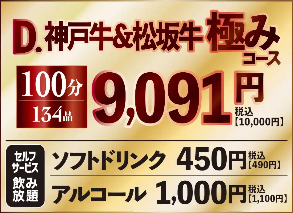 神戸牛は但馬牛の系統で「繊細で美しい霜降り」が特徴。松阪牛は「濃厚な旨みととろけるような甘み」が特徴のともに最高級ブランド和牛です。事前予約で和牛肉パフェを無料サービスしております。ご希望のメッセージを添えて大切な記念日を彩ります。席時間100分制LO80分ーーーーーーーー【飲み放題料金】※必ずつけていただいており、詳細は当日ご案内させていただきます。(通常価格)ソフトドリンク450円(税込490円)アルコール:1,000円(税込1,100円)(LINE友達価格)ソフトドリンク350円(税込380円)アルコール:750円(税込820円)